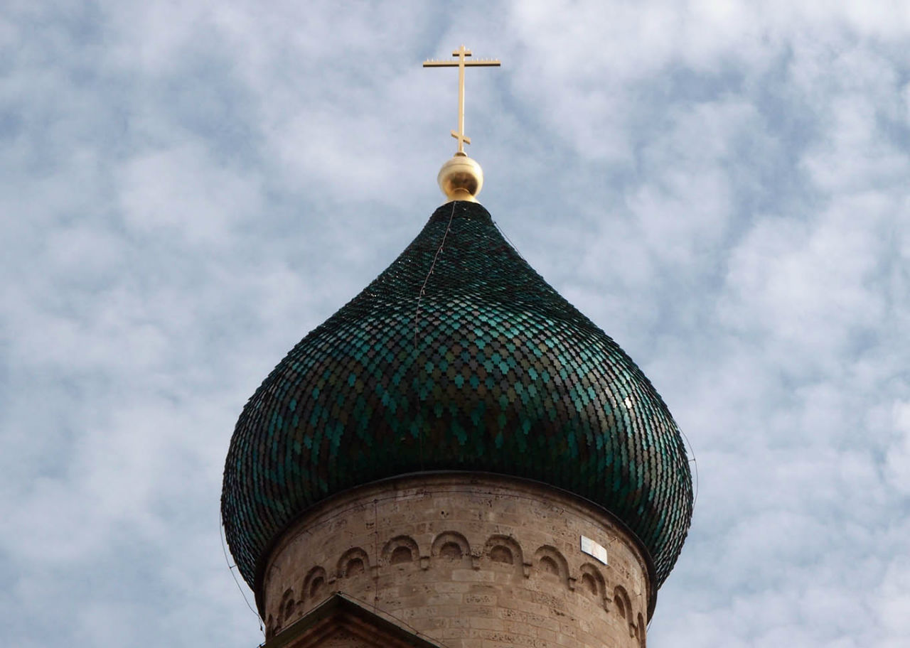 Сверяясь с навигатором, мы прошагали от вокзала вдоль пары довольно протяжённых улиц, и через некоторое время увидели впереди звонницу и такой типичный, такой русский купол-луковку.