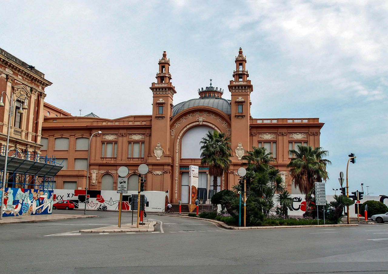 Красивое здание в стиле модерн с фасадом, украшенным двумя башнями и встроенной широкой аркой стоит на самом берегу моря. Как же властям удалось обойти условия договора и выдать разрешение на постройку театра Маргарита? Очень просто! Здание возвели на сваях, укрепленных на дне моря, и получается, оно находится не на городской земле, а на морской территории.