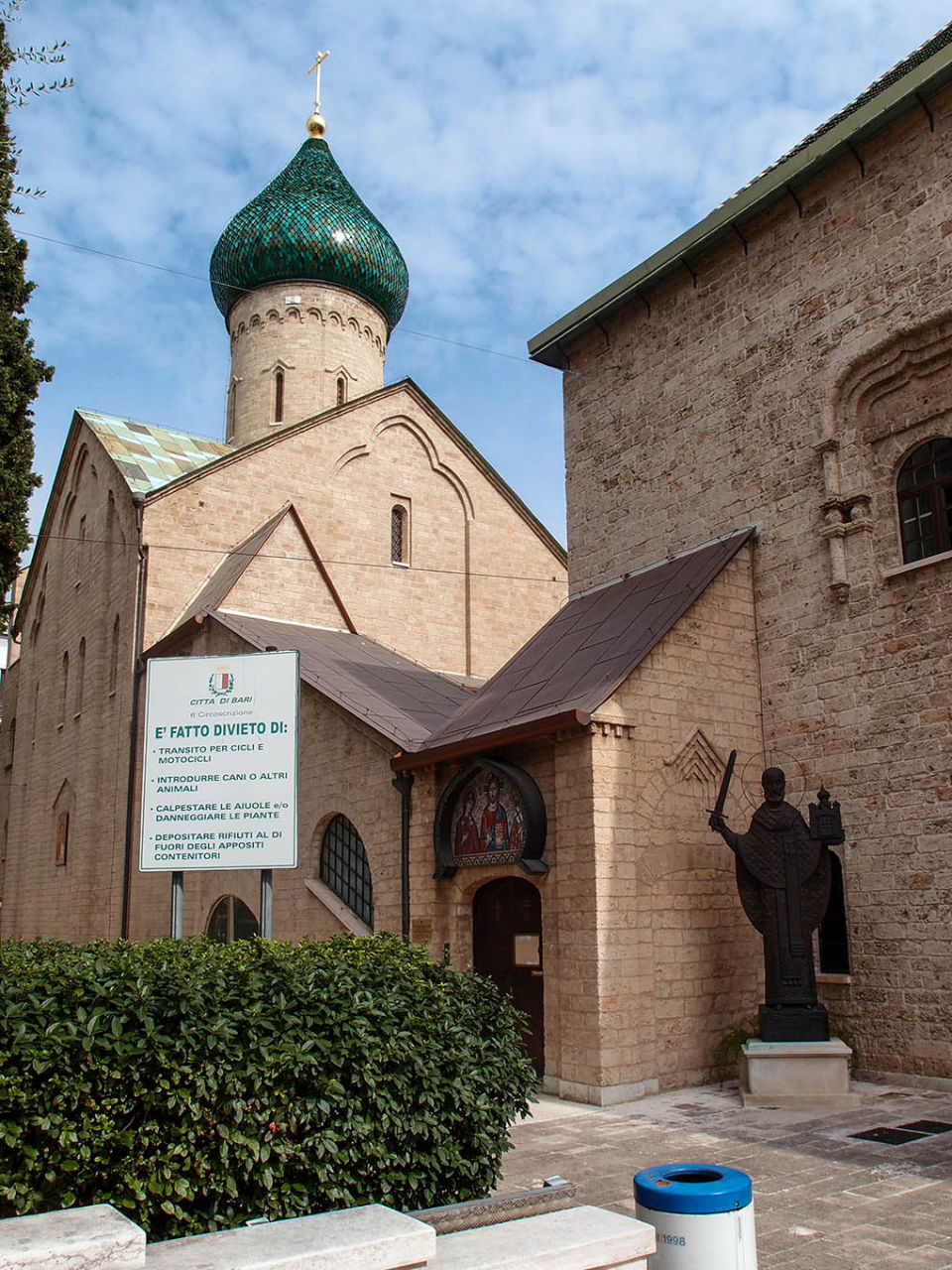 Православная церковь Николая Чудотворца была построена в Бари в 1913-1915 годах, в характерном, старо-новгородском стиле. Проект здания принадлежит знатоку древнерусского храмового зодчества А. В. Щусеву.