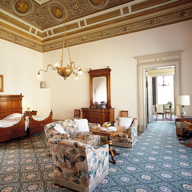 Королевские кровати, балконы с видом на озеро Комо, высокие потолки со старинными люстрами и мебель XIX века — так выглядит отель Villa Serbelloni, в котором история сопровождает вас повсюду