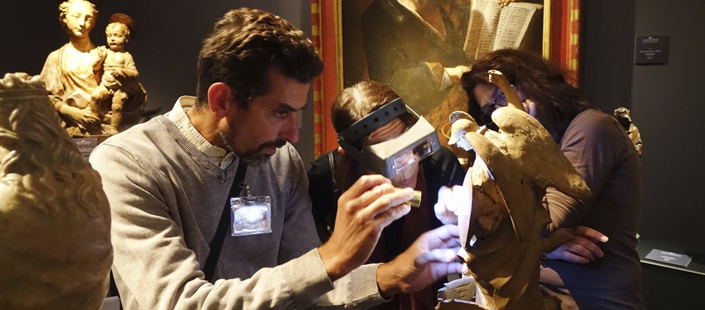 Trittico portatile raffigurante al centro la “Crocifissione con San Giacomo e papa Urbano V” a sinistra “Angelo Annunziante; Natività; Adorazione dei Magi”, a destra “Vergine Annunziata; Flagellazione; Giudizio di fronte a Pilato”.