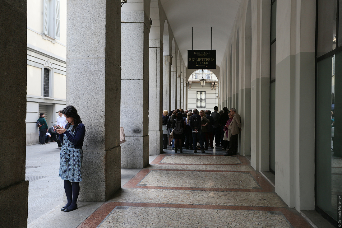 Итак, сходить в театр Ла Скала за 13 евро монжно по котрамарке. Когда-то контрамарка стоила всего 10 евро, сегодня - 13. Чтобы ее получить надо в день спектакля подойти к вечерней кассе театра к 12 часам дня. Если стоять лицом к театру, то это с левой стороны.