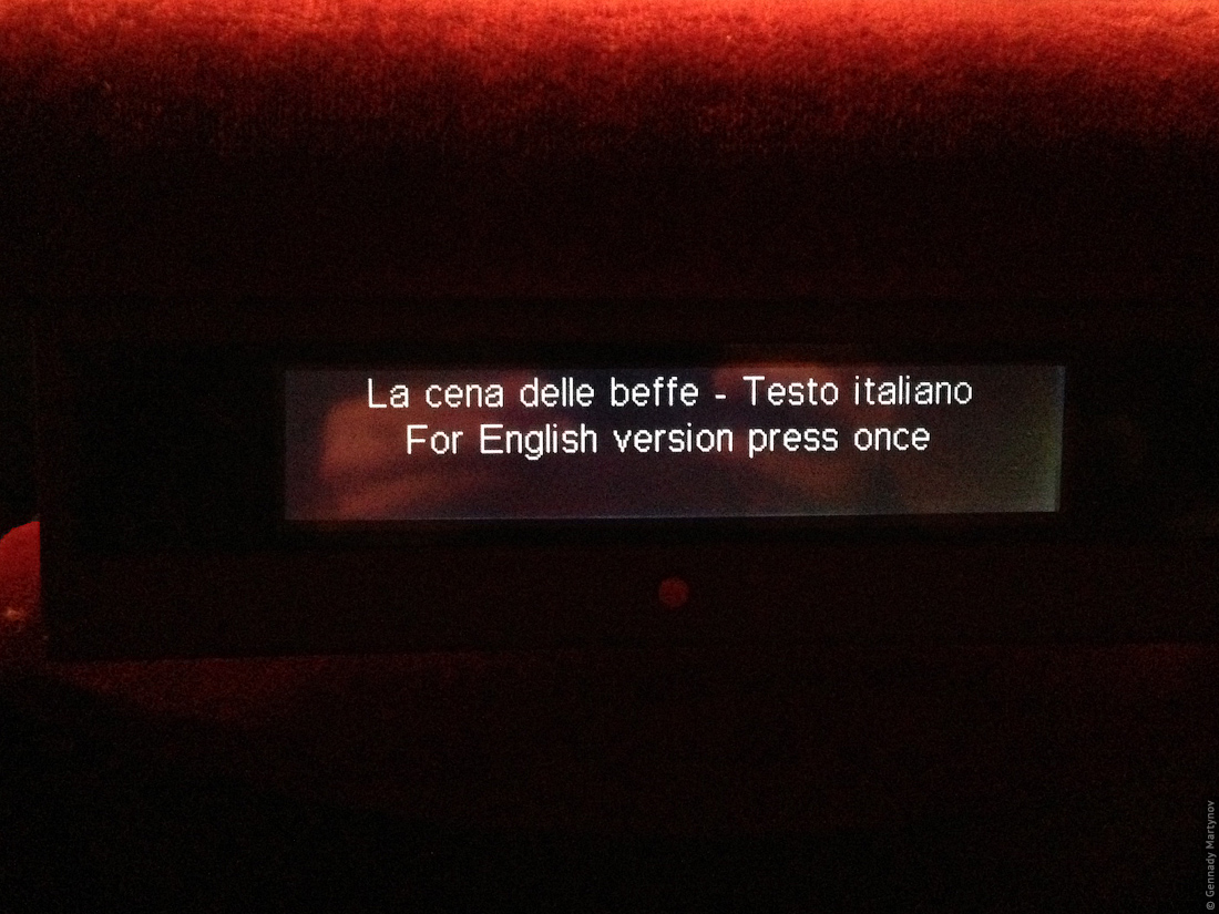 Все фразы актеров дублируюстся на экранчике в задней части спинки. Можно выбрать английский язык.