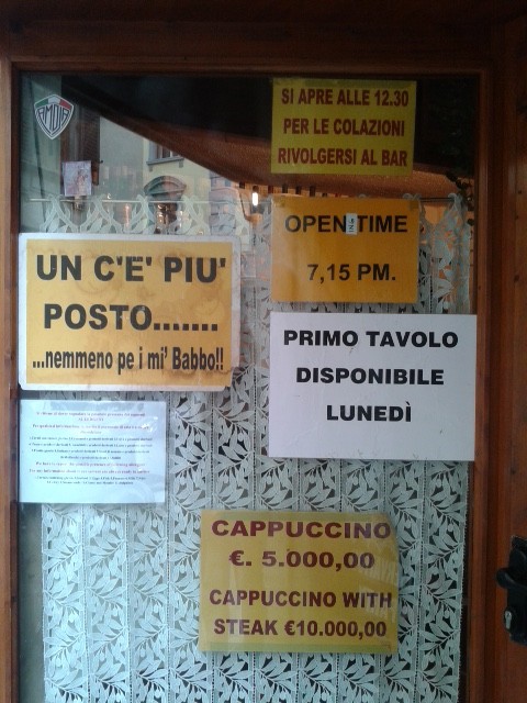 Вот и живое свидетельство: вывеска на двери одного из местных ресторанчиков красноречиво разъясняет, что здесь «капучино 5 000,00 евро, капуччино со стейком — 10 000,00 евро». Как ни крути, но итальянцы — пуристы во всем, что касается еды.