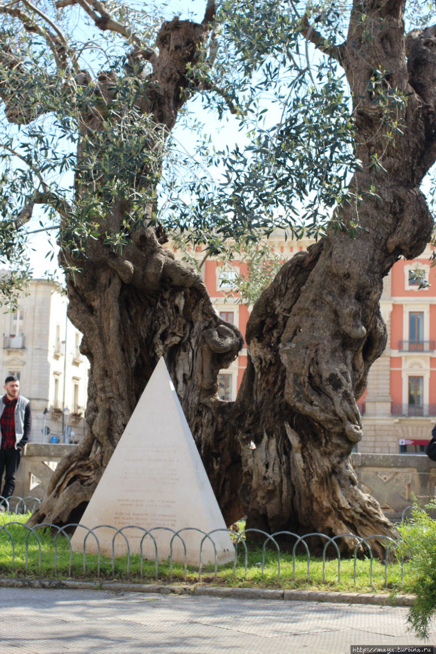 Сразу за статуей – оливковое дерево. Ну, очень старое! Ему явно несколько сот лет. И перед ним, конечно, стоит табличка с надписью. Только прочесть, что там написано, увы, не представляется возможным. Буквы стерты.