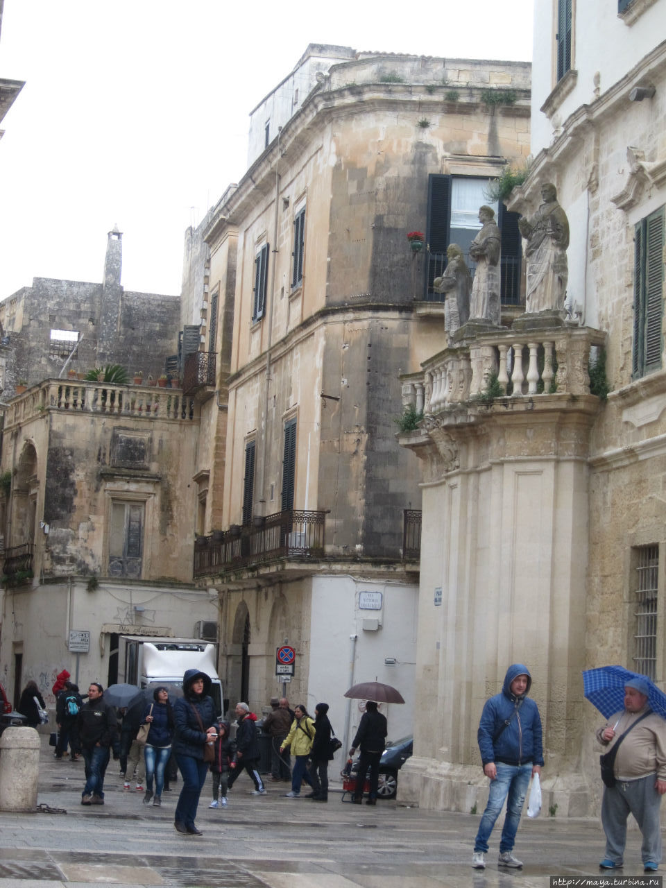 В отличие от белого города, Остуни, Лечче теряет часть своего очарования, когда нет солнца. Мокрые стены теряют свой сияющий, золотистый цвет. И, хотя скульптуры и барельефы удивляют своей красотой, исчезает ощущение чуда. И мы отправляемся дальше.