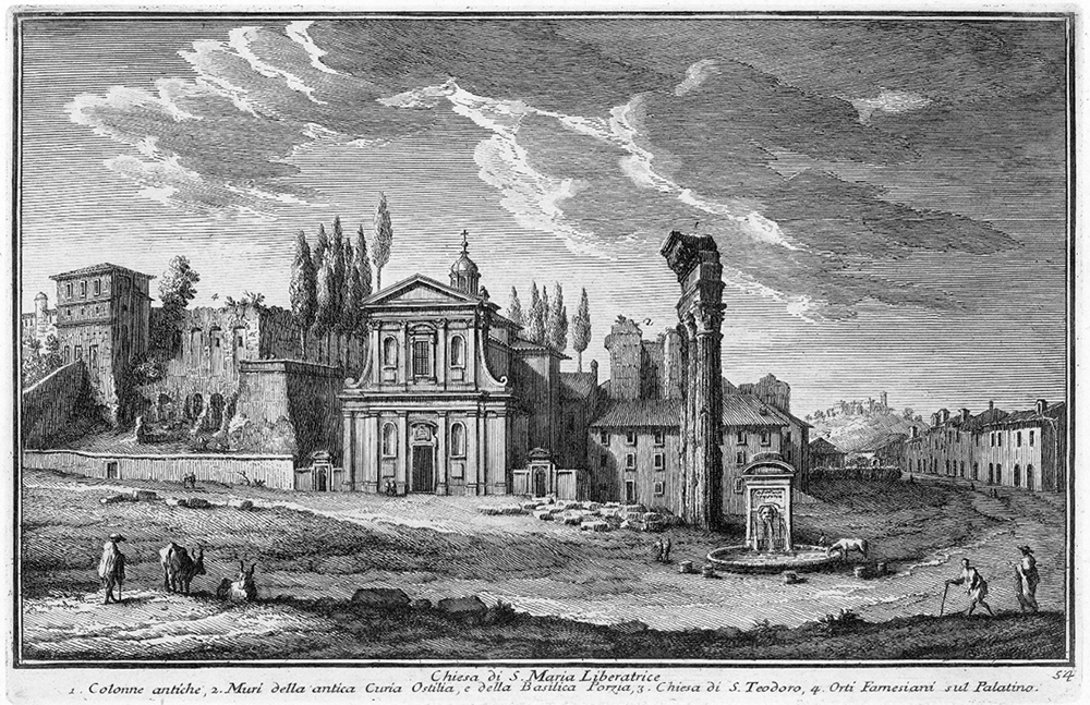 В середине VI в. сооружение времён Домициана использовалось как своего рода сторожевая будка: здесь ночевала охрана византийских наместников Рима. Ближе к концу века оно было убрано коринфскими колоннами, украшено стенописью, к нему была пристроена полукруглая апсида - отныне это была церковь девы Марии. Под основанием одной из колонн археологи обнаружили клад монет с профилем Юстина II, из чего следует, что перестройка не могла быть осуществлена ранее его царствования (565-578 гг.) В папском инвентаре 635 г. здание упоминается уже как "Санта-Мария-Антиква", то есть "старая дева Мария", - свидетельство существования более нового храма с тем же посвящением.