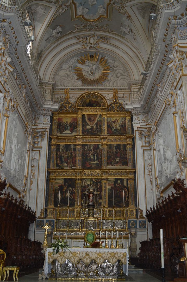 В соборе находится несколько старинных шедевров: мраморные статуи «Мадонна ди Трапани» (1470 г.), приписываемая ученику Франческо Лаураны, и «Мадонна дель Соккорсо» (1507 г.), приписываемая скульптору Джорджо да Милано. Своды расписаны великолепными фресками на темы Ветхого и Нового Завета в конце XVIII в. местным живописцем Джан Баттистой Рагацци и его сыном. Пол собора выложен в 1864 г. со вставками разноцветного мрамора и местного черного «смоляного камня». <.....>