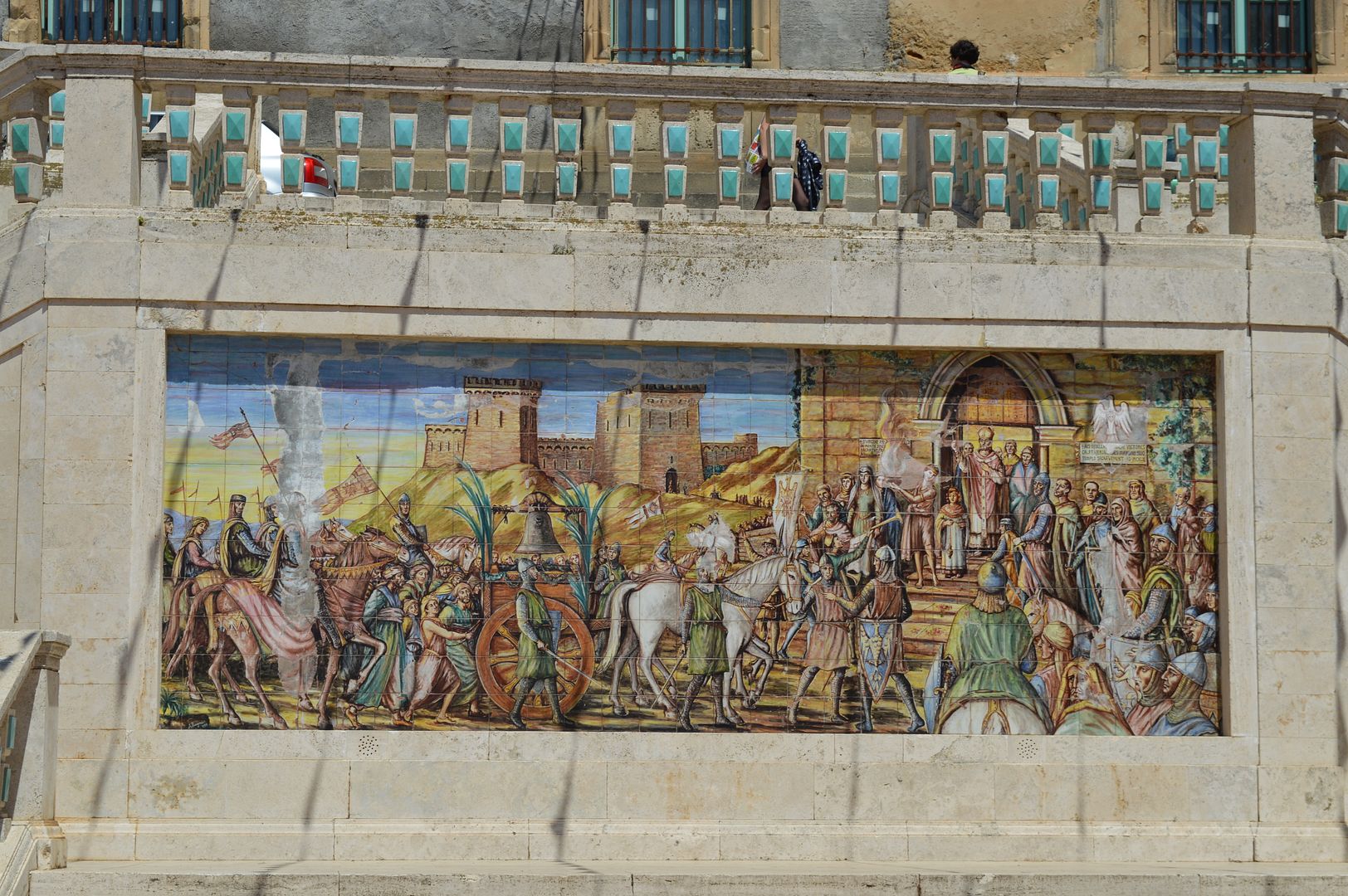 Естественно, и здесъ не обошлосъ без маиолики. На панно - победоносный Рожер I въезжает в освобожденный от сарацин Кальтаджироне.