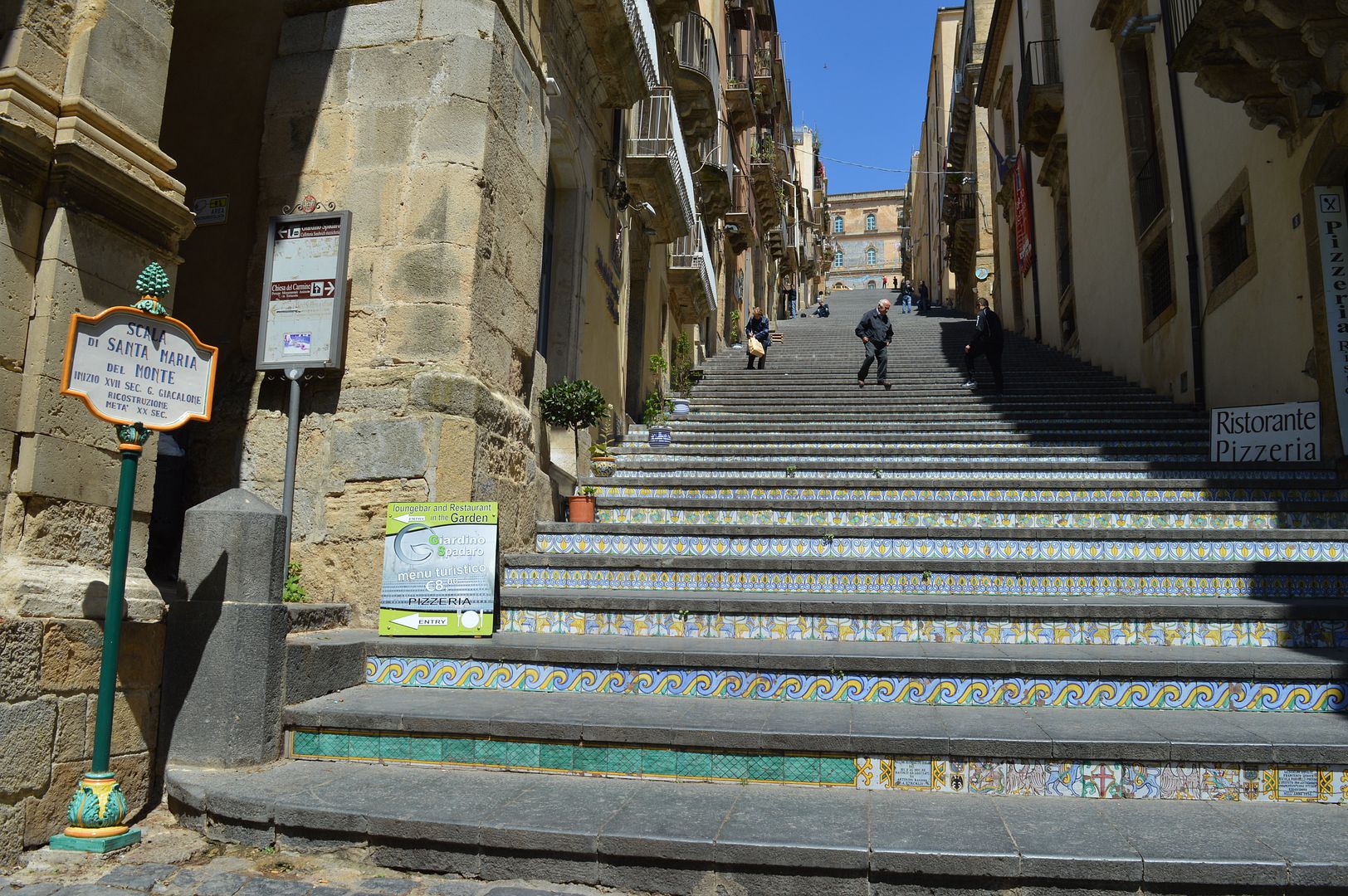 Лестница связана с важнейшими храмами города: у основания лестницы слева находится церковь святого Иосифа Обручника (вот, оказывается, как называлась!), почти на середине высоты лестницы возведена церковь Богоматери монастыря кармелитов (так пыхтела, поднимаясъ, что даже не заметила ), а на вершине холма располагается церковь святой Марии на Горе 1606 года, к которой подводят ступеньки лестницы. В мае во время праздника Мадонны Владычицы, вся Лестница украшается живыми цветами, составляющими грандиозный декоративный рисунок.