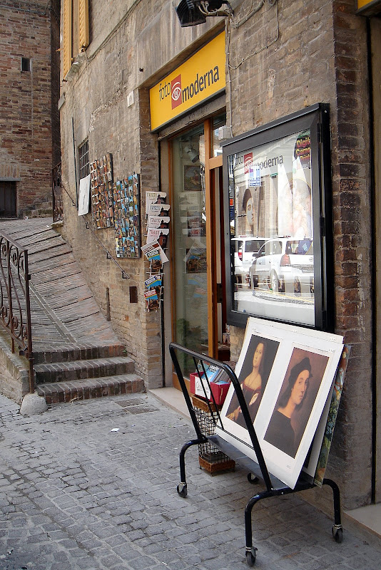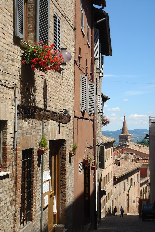 Город находится под охраной Юнеско не случайно — здесь нет вообще ничего современного! Блуждающий по городу турист не наткнется здесь на современное здание, здесь даже дорожные знаки, эти вечные убийцы хороших видов, попадаются нечасто. По узким крутым улочкам медленно ползут крохотные, почти игрушечные автобусы. В каждой сувенирной лавочке — репродукции картин Рафаэля; итальянский гений родился здесь. По нереально синему небу плывут облака сахарной ваты. Это другая, параллельная реальность — как будто ты открыл потайную дверцу, сделал шаг и попал в другое измерение. Ощущение подглядывания не оставляет! Мы нашли ресторан, уселись у окна с видом на крутую улочку — выцветшие желтые стены, старые камни мостовой, зеленые деревца в терракотовых кадках, кованый узор решеток. Я в очередной раз решила, что это и есть эталонный итальянский город. Удивительно, что Италия имеет столько разных лиц, но все они кажутся нам знакомыми. Я не знаю ни одного итальянского города, по поводу которого я могла бы сказать, что Италию я представляла себе не так. Мортон, чьи «Прогулки по Северной Италии» скрашивают мне адаптацию к московской беготне, в самом начале главы про Венецию пишет: «Венеция и Рим схожи в том, что не вонзают в тебя острый нож открытия, они лишь легонько подталкивают в бок: смотри, узнаешь? Впечатление такое, будто живешь второй раз и видишь места, знакомые из первой жизни». Такая точка зрения на Рим спорна — сколько я ни читала про Вечный город, сколько ни видела программ и фильмов, открыток и журнальных статей, Рим все равно оказался абсолютно не таким, каким был он в моем сознании, по всем остальным итальянским городам я бродила в том самом состоянии узнавания. Хотя, если подумать, современный путешественник все же лишен того первозданного, естественного удивления, которое испытывали люди хотя бы столетие назад. Вольно или невольно, мы узнаем мир — для кого-то он складывается из обрывков услышанных фраз и фрагментов фотографий, кто-то целенаправленно, главу за главой, листает его как книгу. Именно поэтому моменты удивления, пусть даже и случившиеся не сразу, становятся особенно ценны.
