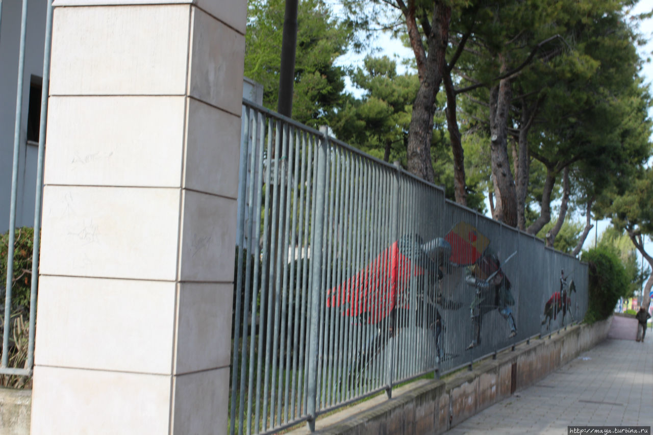 Впрочем, нет, замок был не первым. Первым был забор. От площади королевы Елены, крепость и парк окружает забор. И на этот забор нанесен рисунок, который не виден ни вблизи, ни издалека, а только под определенным углом. Иду я вдоль забора, и вдруг вижу рыцарский бой. Я вернулась, прошла еще раз. И начала фотографировать. И тут люди стали останавливаться и смотреть. А раньше этих рисунков никто не заметил.