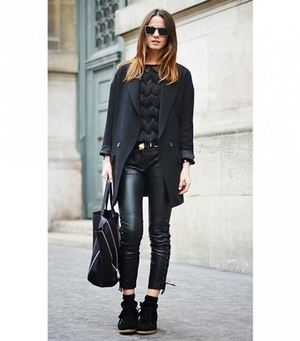 Чем прекрасен total black? Вы можете сочетать различные текстуры, не боясь перегрузить композицию. Заметьте, как Зина Чаркоплия (Fashion Vibe) смешала бахрому, кожу и замшу в одном шикарном образе.