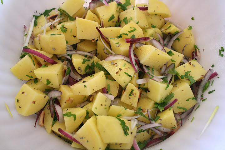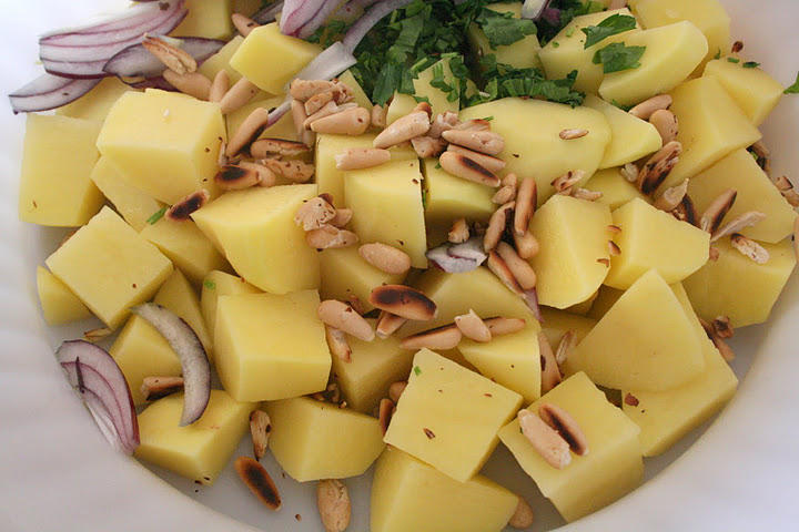 Очищенный картофель нарезать крупными кубиками и соединить с нарезанным тонкой соломкой луком, рубленой петрушкой и обжаренными кедровыми орехами, добавить соль, перец черный молотый по вкусу, белое вино и оливковое масло. Все равномерно перемешать.