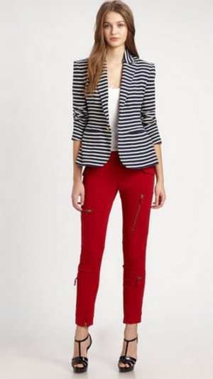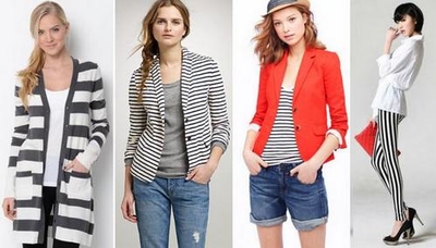 5. Универсальные полосатые жакеты. Жакеты (пиджаки и блейзеры) в черно-белую или сине-белую горизонтальную полоску подходят к самой разной одежде, начиная от платьев-футляров и заканчивая джинсовыми шортами.