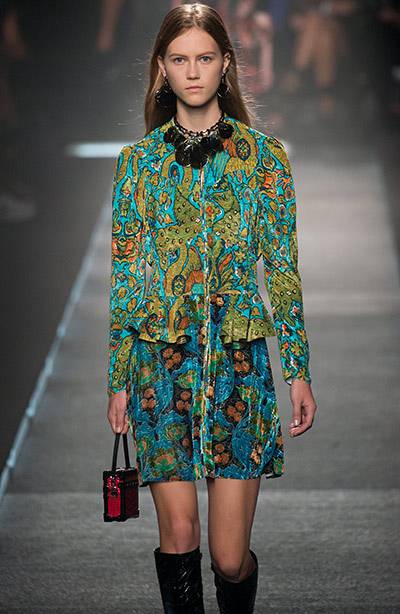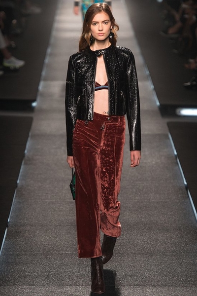 Самым ярким акцентом коллекции стал благородный мерцающий бархат. Из него Николя Гескьер сшил укороченные брюки, костюмы-двойки и платья. А психоделические узоры, украсившие некоторые бархатные модели, дизайнер, по его собственному признанию, «подсмотрел» на тканях, которые родом из той же эпохи семидесятых. Оригинально выглядели и полосатые кожаные платья, и мини-платья, «сплетенные» из тонких тканых ленточек.