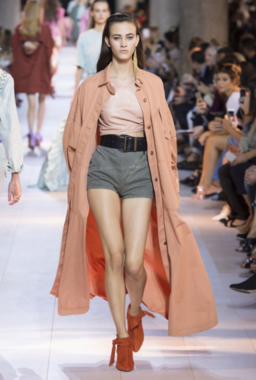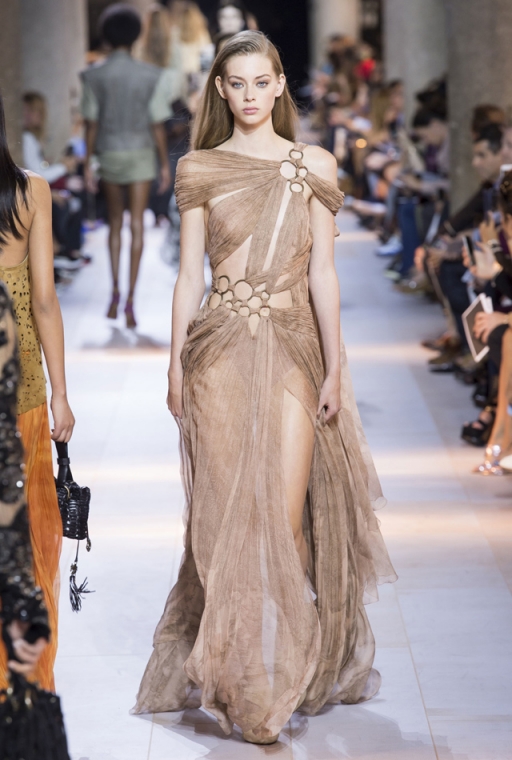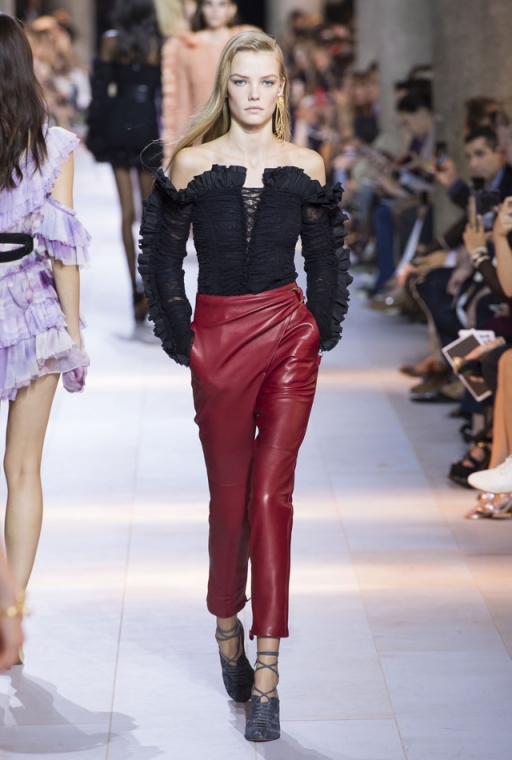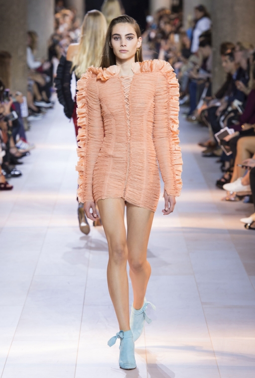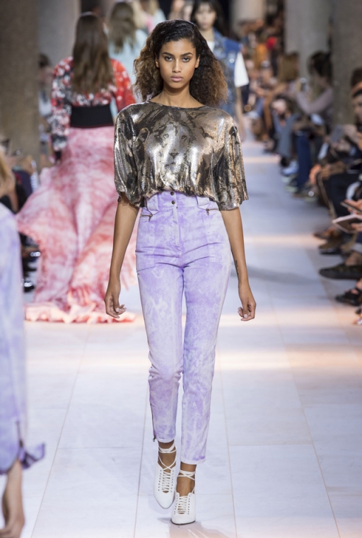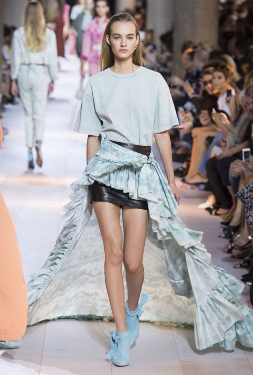 Впрочем, роскошные платья в пол с развевающимися юбками и кусочками голого живота тоже здесь — просто для ценителей старого доброго Roberto Cavalli, которых вполне могли бы напугать, например, бесформенные плащи. Но за этой вечной классикой идут куда более веселые и даже откровенно забавные варианты. Платья, собранные из воздушных оборок, или платья с такими же оборками, уже держащими форму и гребнем идущими по плечам, выглядели немного монструозно, но весело.
