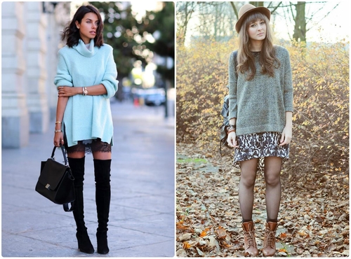 Платье должно лишь немного выглядывать из-под свитера. Надевать длинное платье с огромным свитером стоит лишь в том случае, если вы придерживаетесь стиля бохо или гранж.