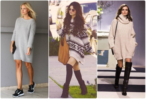 Если длина свитера позволяет, смело надевайте его как теплое платье. Правда, эффектней всего такой наряд смотрится, если надевать платье-свитер на голые ноги.